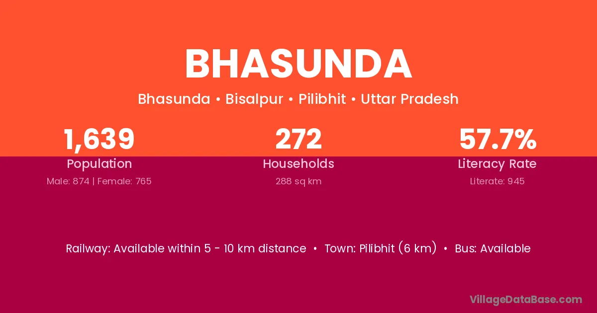 Pilibhit (6 km) is the nearest town to Bhasunda village for major economic activities and is located approximately 6 km away.