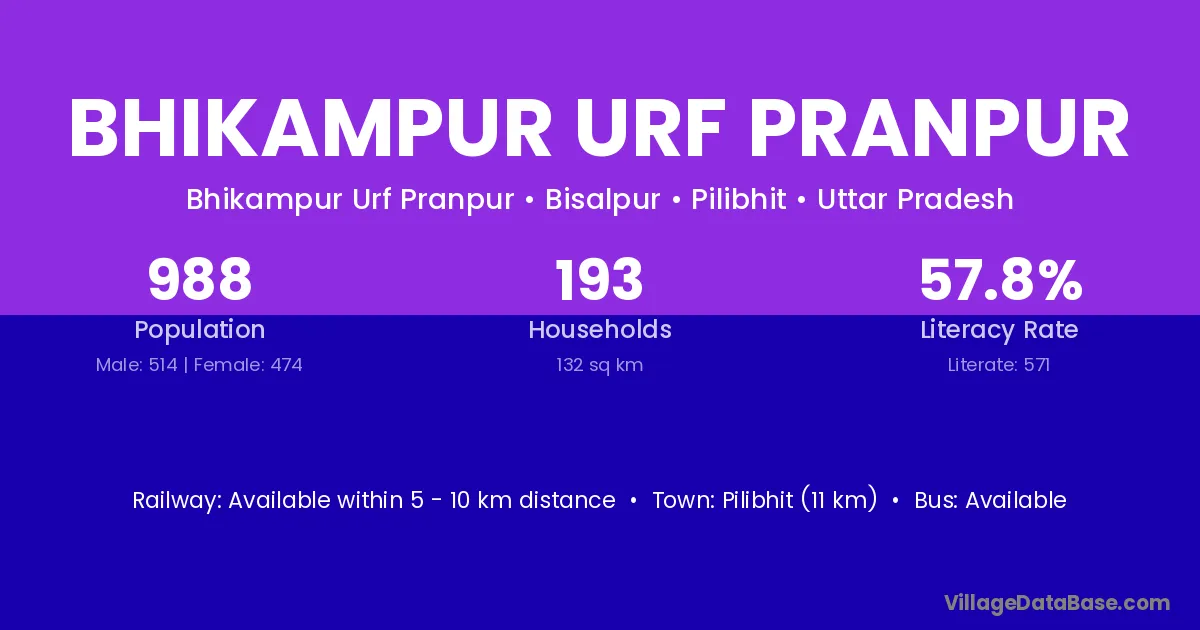 Bhikampur Urf Pranpur village has a total population of 988 people, of which 514 are males and 474 are females.