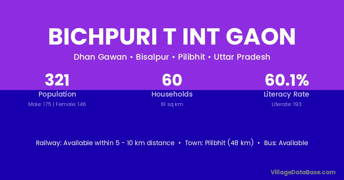 Bichpuri T Int Gaon village has a total population of 321 people, of which 175 are males and 146 are females.