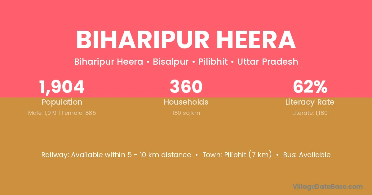 Pilibhit (7 km) is the nearest town to Biharipur Heera village for major economic activities and is located approximately 7 km away.
