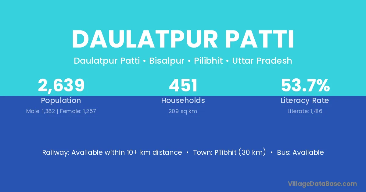 Pilibhit (30 km) is the nearest town to Daulatpur Patti village for major economic activities and is located approximately 30 km away.