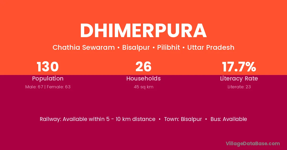 Dhimerpura village has a total population of 130 people, of which 67 are males and 63 are females.