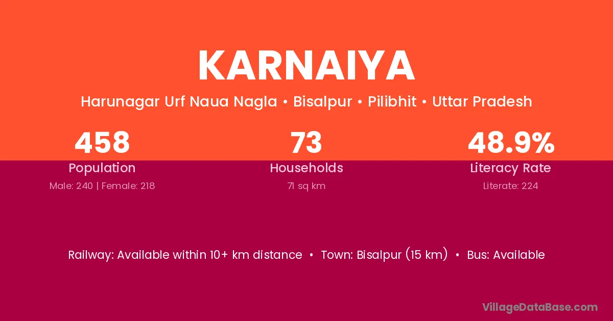 Karnaiya village has a total population of 458 people, of which 240 are males and 218 are females.