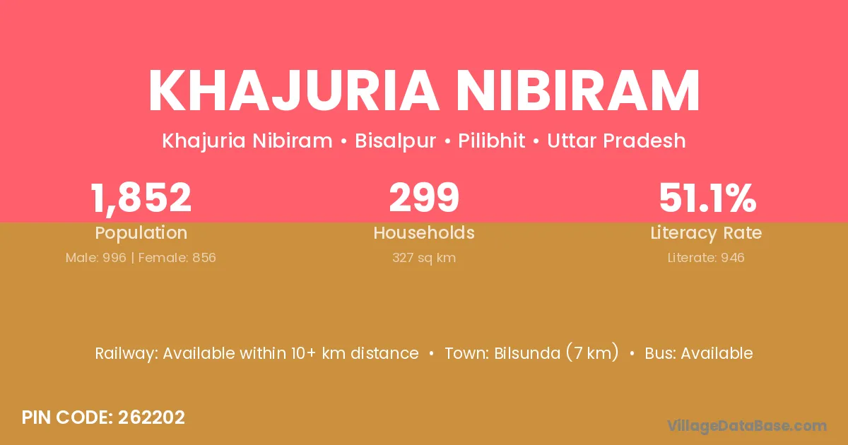 Khajuria Nibiram village has a total population of 1,852 people, of which 996 are males and 856 are females.