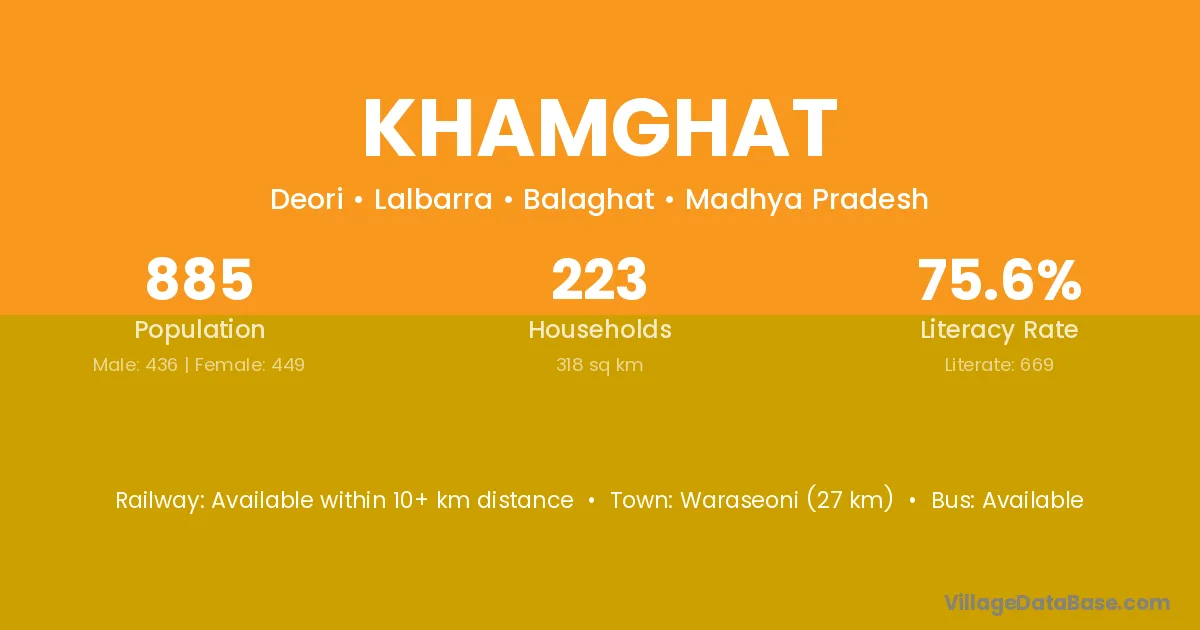 Khamghat village has a total population of 885 people, of which 468 are males and 417 are females.