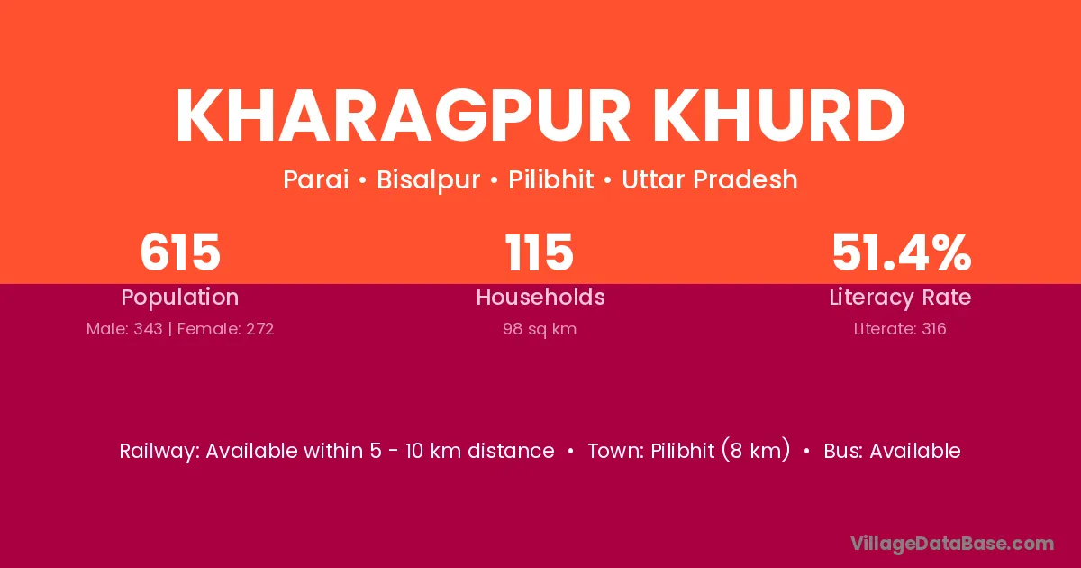 Pilibhit (8 km) is the nearest town to Kharagpur Khurd village for major economic activities and is located approximately 8 km away.