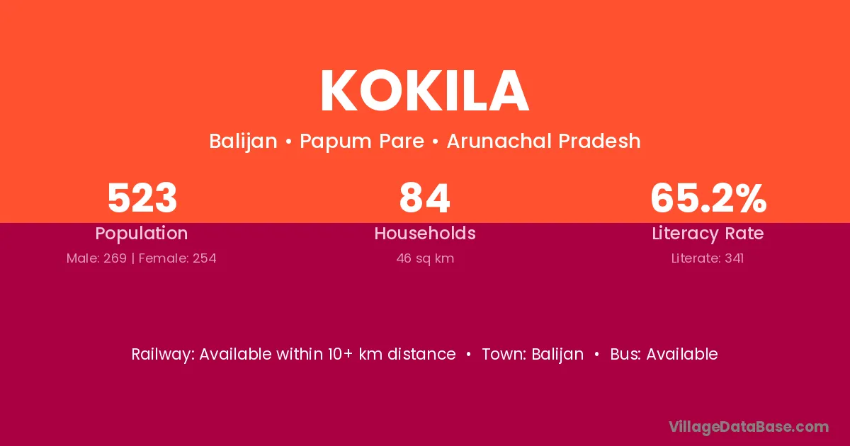 The literacy rate of Kokila village is 50.79%. Male literacy stands at 65.05% and female literacy at 33.97%.
