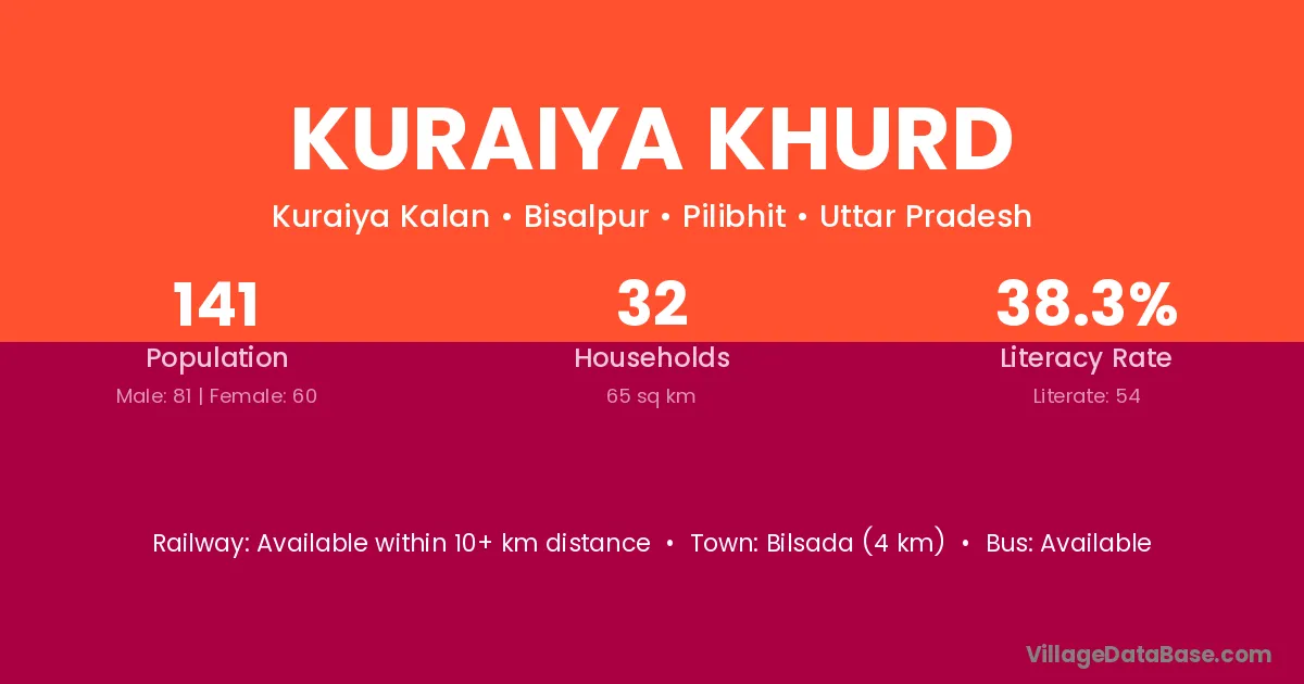 Kuraiya Khurd village has a total population of 141 people, of which 81 are males and 60 are females.