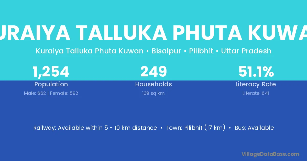 Pilibhit (17 km) is the nearest town to Kuraiya Talluka Phuta Kuwan village for major economic activities and is located approximately 17 km away.