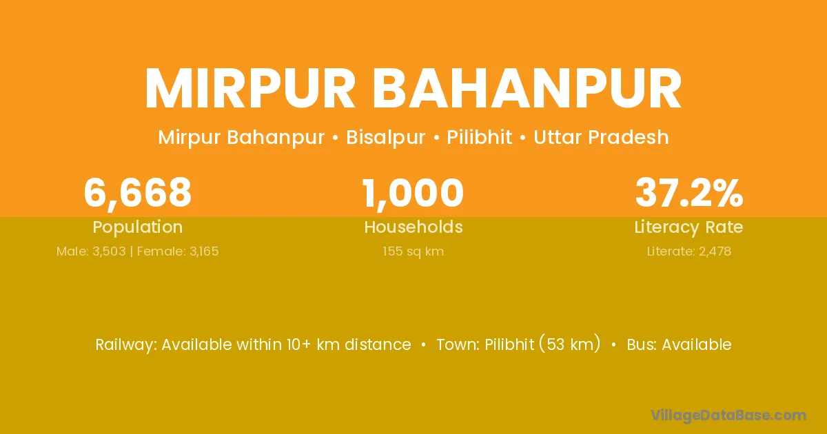 Pilibhit (53 km) is the nearest town to Mirpur Bahanpur village for major economic activities and is located approximately 53 km away.