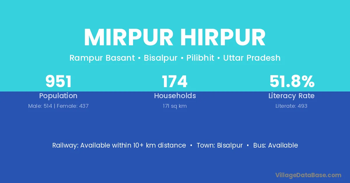 Mirpur Hirpur village has a total population of 951 people, of which 514 are males and 437 are females.