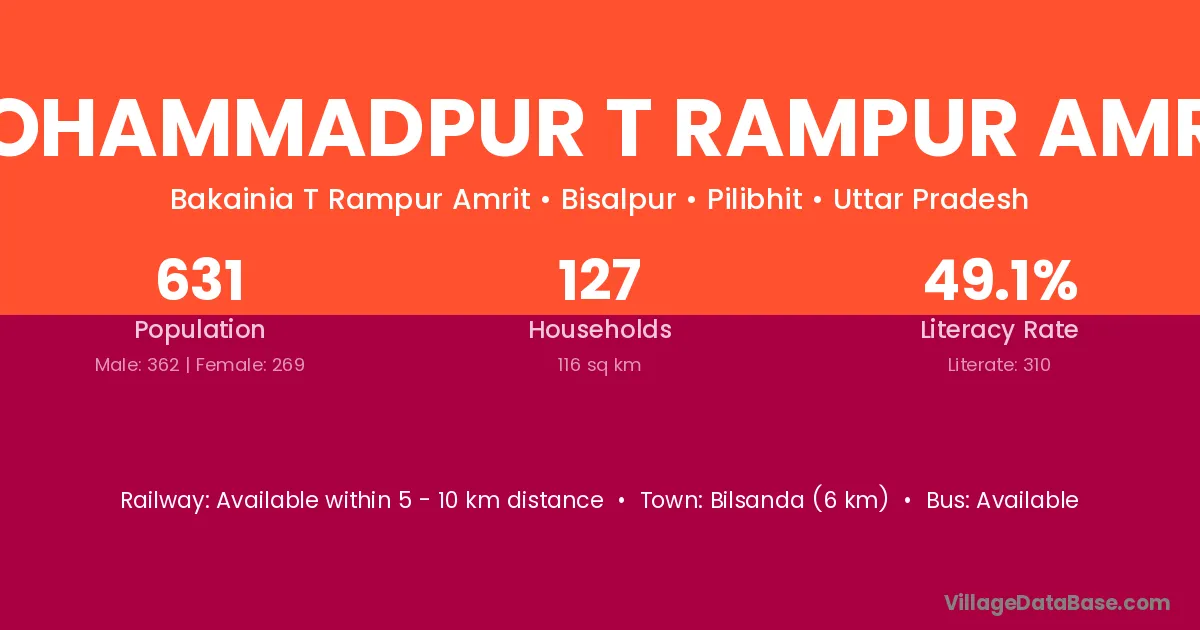 Mohammadpur T Rampur Amrit village has a total population of 631 people, of which 362 are males and 269 are females.