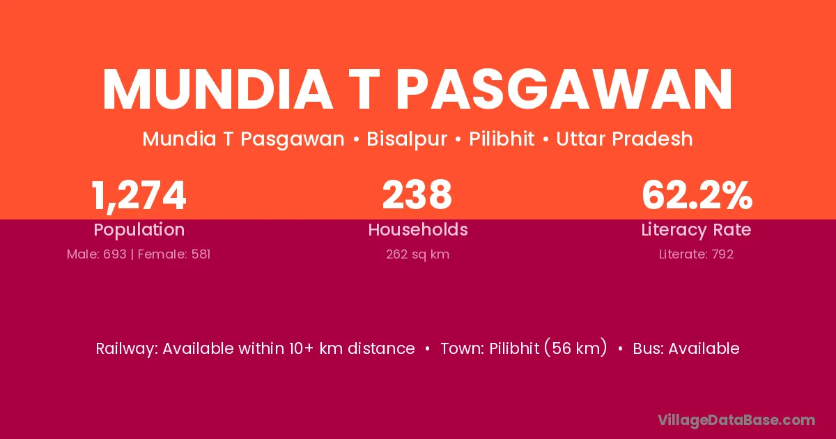 Pilibhit (56 km) is the nearest town to Mundia T Pasgawan village for major economic activities and is located approximately 56 km away.
