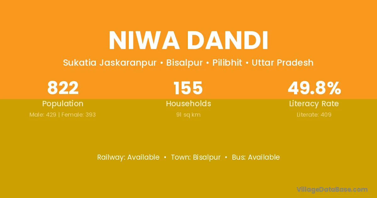 Niwa Dandi village has a total population of 822 people, of which 429 are males and 393 are females.