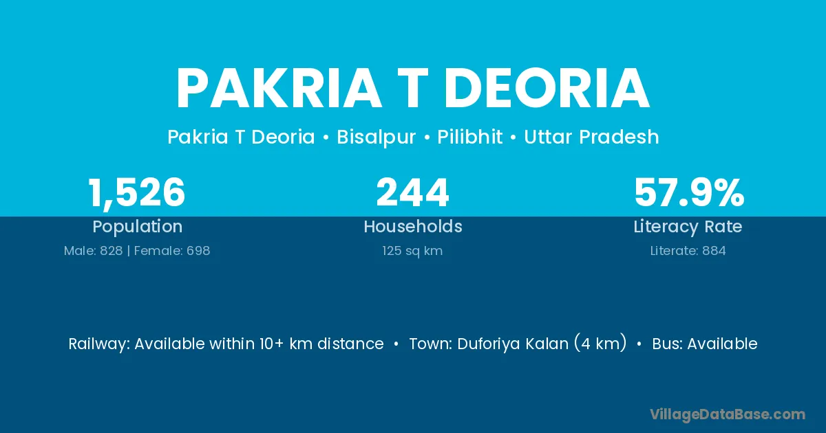 Duforiya Kalan (4 km) is the nearest town to Pakria T Deoria village for major economic activities and is located approximately 4 km away.