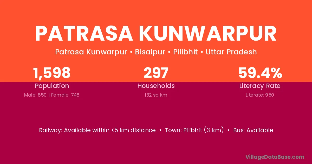 Pilibhit (3 km) is the nearest town to Patrasa Kunwarpur village for major economic activities and is located approximately 3 km away.