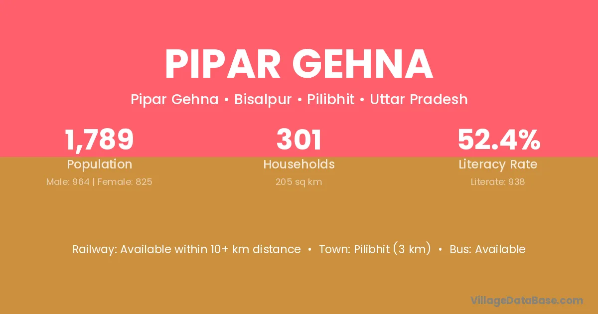 Pilibhit (3 km) is the nearest town to Pipar Gehna village for major economic activities and is located approximately 3 km away.