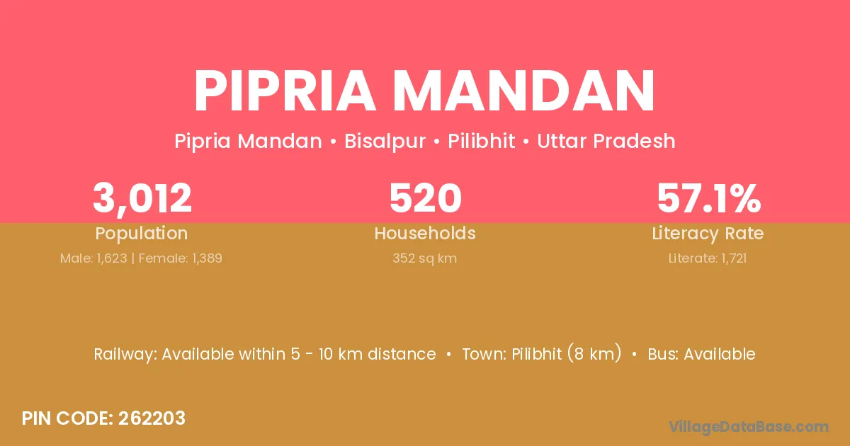 Pilibhit (8 km) is the nearest town to Pipria Mandan village for major economic activities and is located approximately 8 km away.