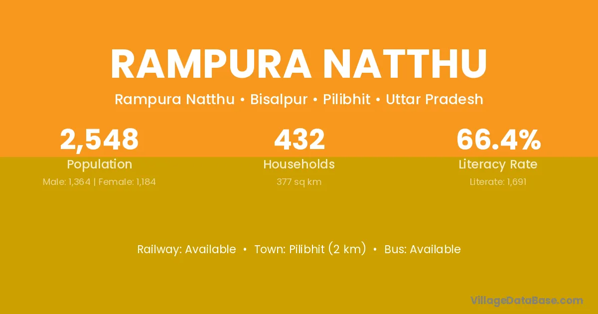 Pilibhit (2 km) is the nearest town to Rampura Natthu village for major economic activities and is located approximately 2 km away.