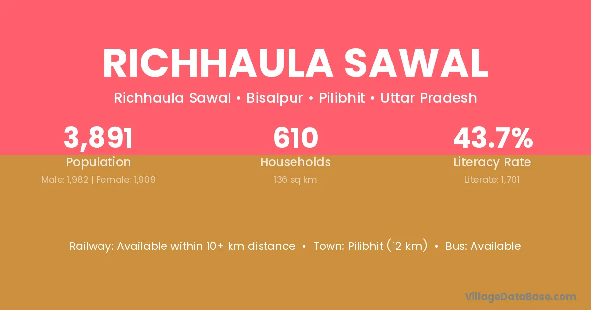 Richhaula Sawal village has a total population of 3,891 people, of which 1,982 are males and 1,909 are females.