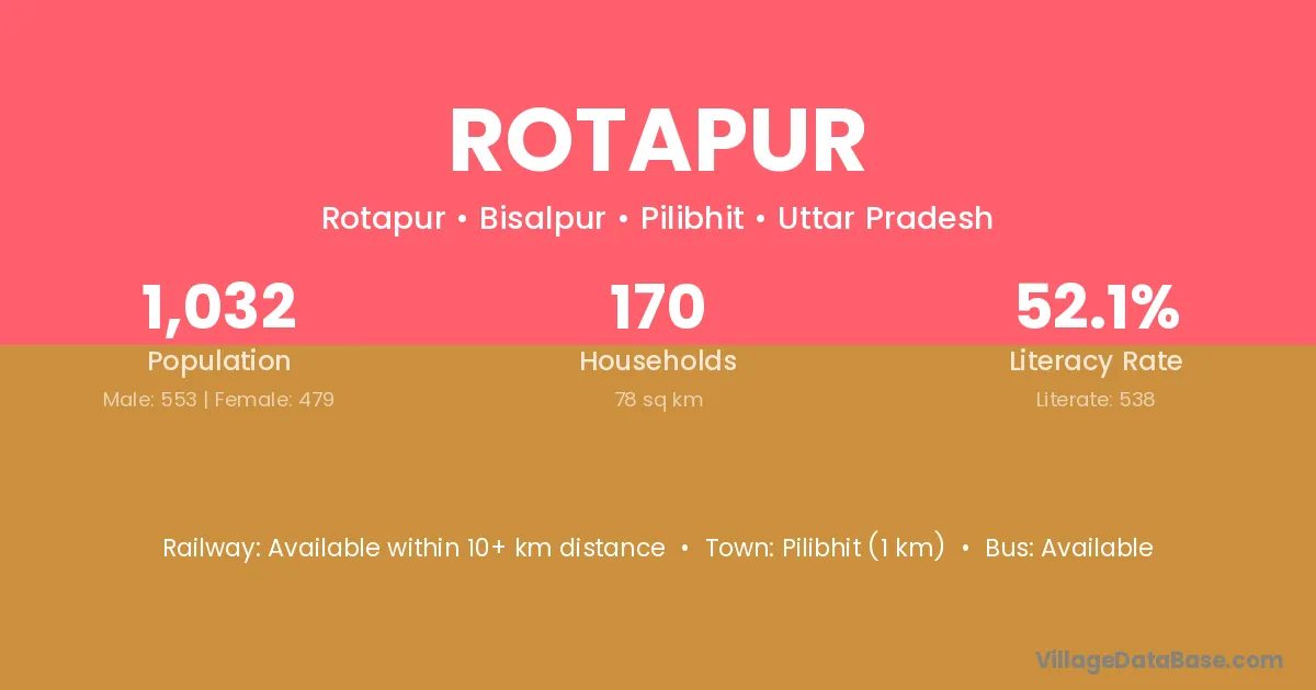 Pilibhit (1 km) is the nearest town to Rotapur village for major economic activities and is located approximately 1 km away.