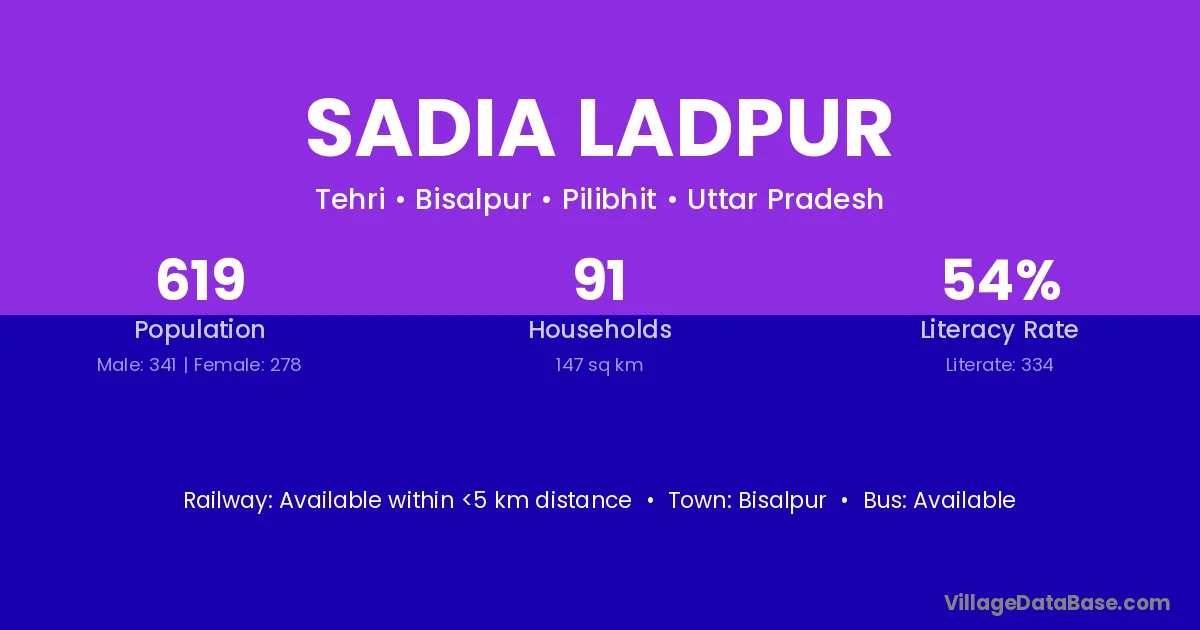 Sadia Ladpur village is located in the Bisalpur Tehsil of the Pilibhit district in Uttar Pradesh .
