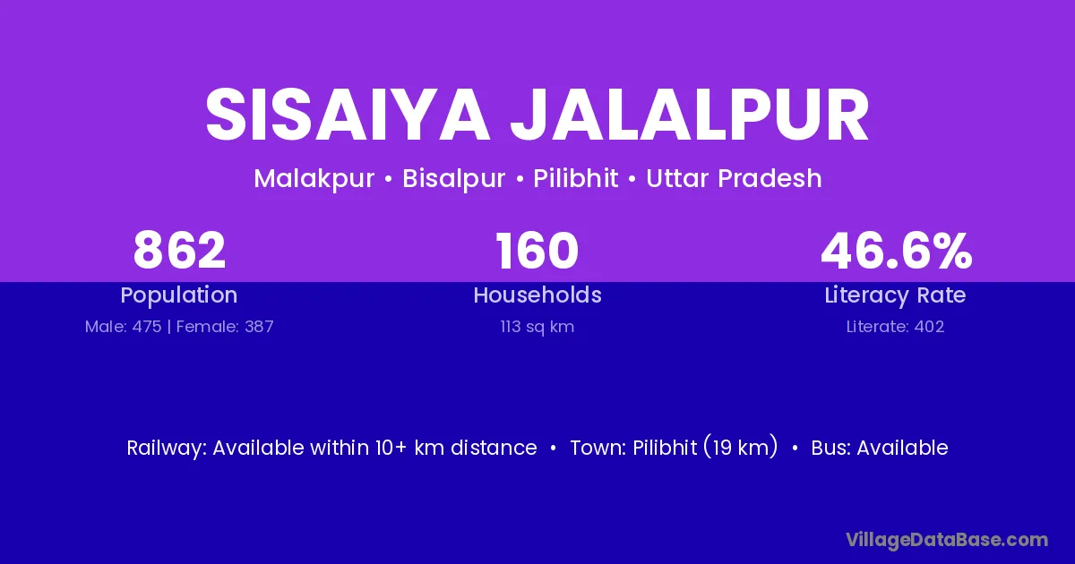 Sisaiya Jalalpur village has a total population of 862 people, of which 475 are males and 387 are females.