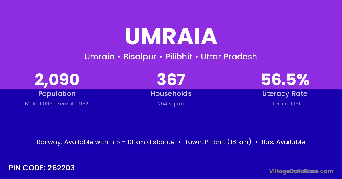 Pilibhit (18 km) is the nearest town to Umraia village for major economic activities and is located approximately 18 km away.