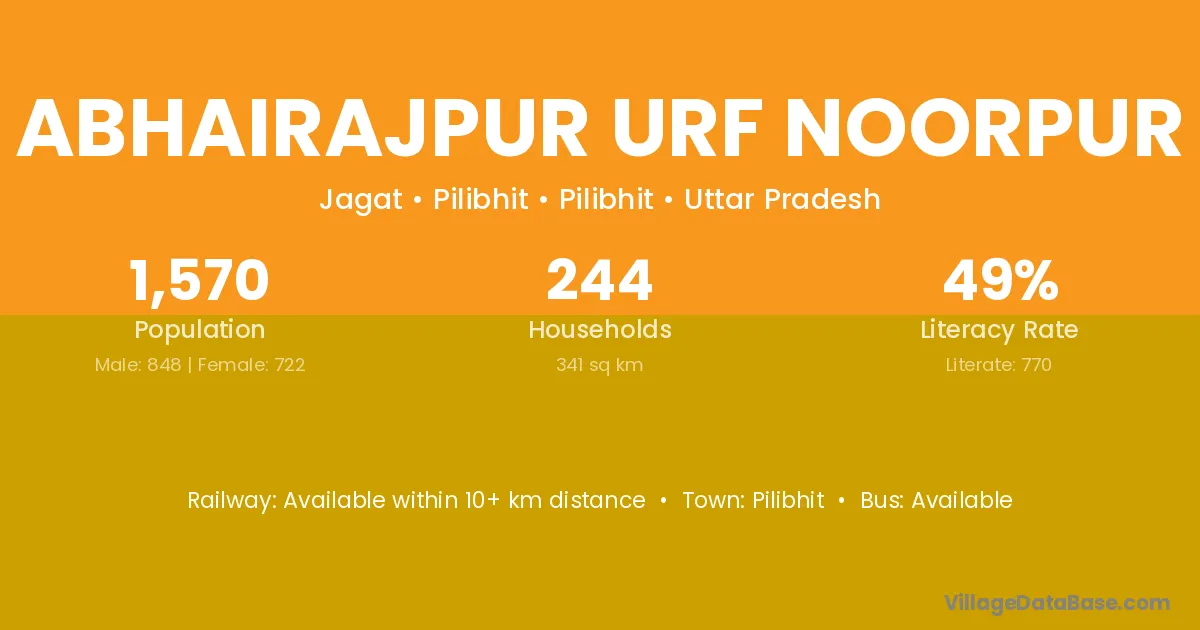 Abhairajpur Urf Noorpur village has a total population of 1,570 people, of which 848 are males and 722 are females.