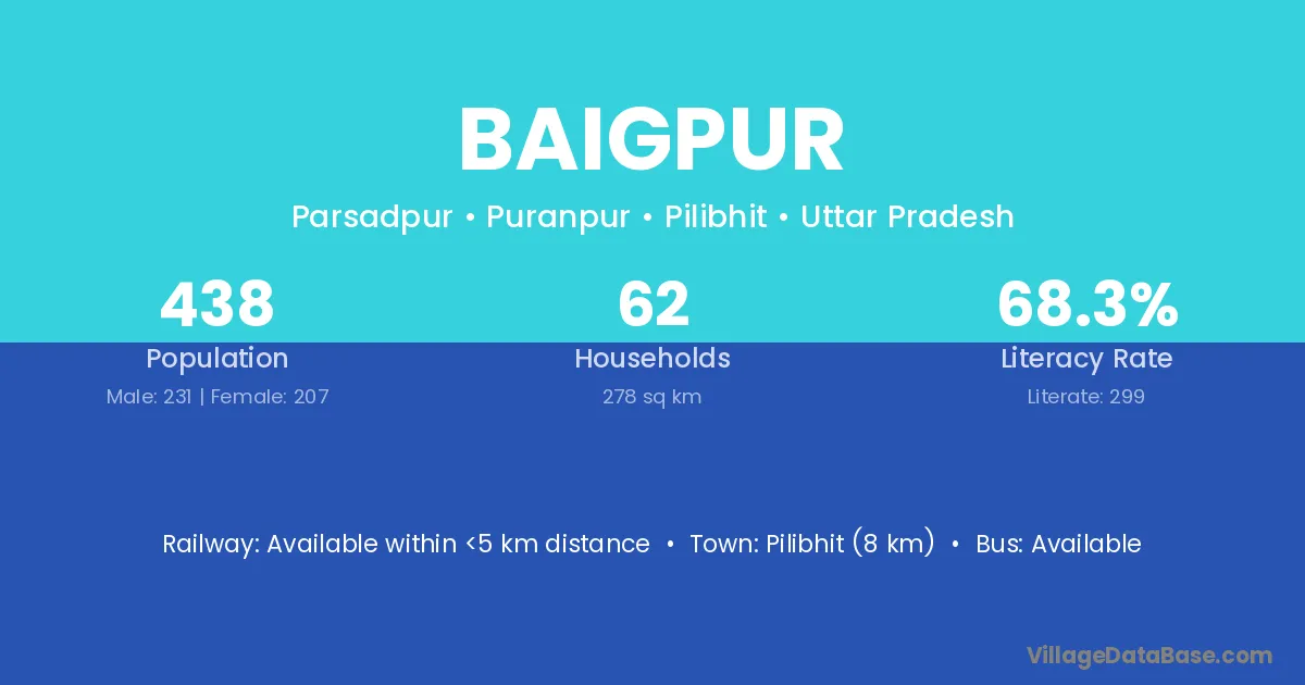 Baigpur village has a total population of 438 people, of which 231 are males and 207 are females.