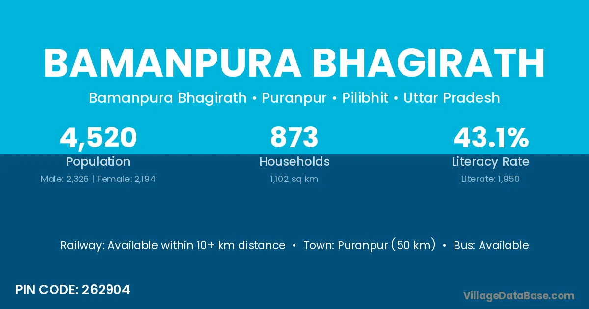 Puranpur (50 km) is the nearest town to Bamanpura Bhagirath village for major economic activities and is located approximately 50 km away.