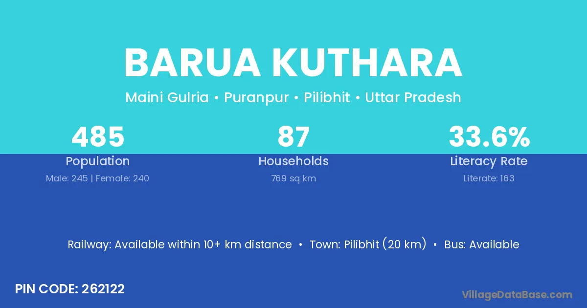 Barua Kuthara village has a total population of 485 people, of which 245 are males and 240 are females.