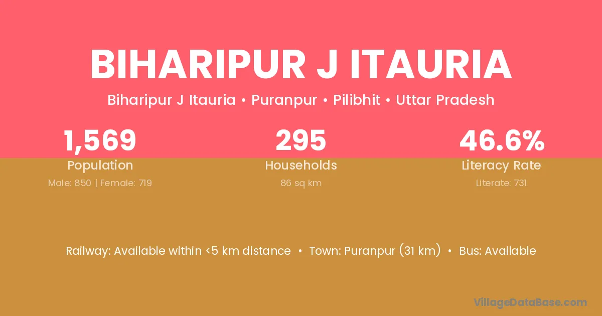 Puranpur (31 km) is the nearest town to Biharipur J Itauria village for major economic activities and is located approximately 31 km away.