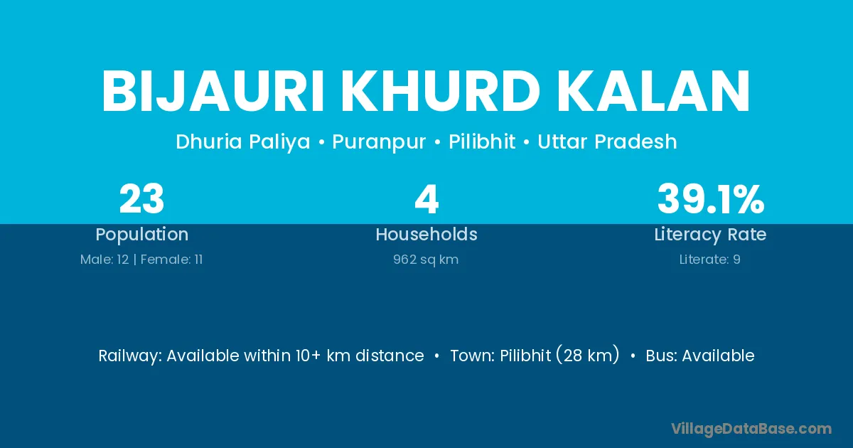 Pilibhit (28 km) is the nearest town to Bijauri Khurd Kalan village for major economic activities and is located approximately 28 km away.