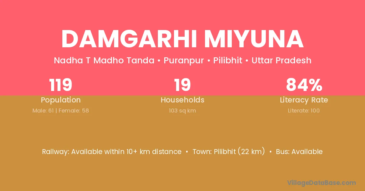 Pilibhit (22 km) is the nearest town to Damgarhi Miyuna village for major economic activities and is located approximately 22 km away.