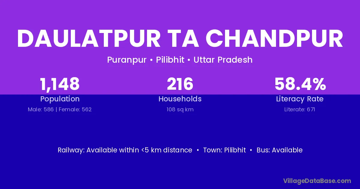 Daulatpur Ta Chandpur village has a total population of 1,148 people, of which 586 are males and 562 are females.