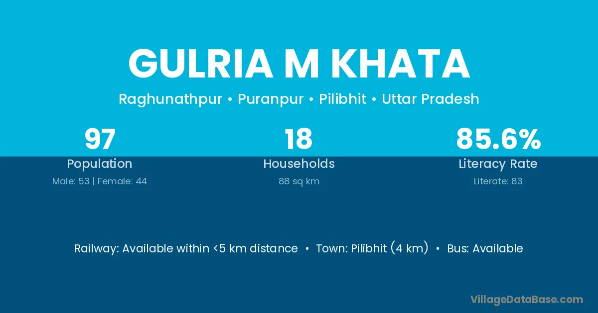 Pilibhit (4 km) is the nearest town to Gulria M Khata village for major economic activities and is located approximately 4 km away.