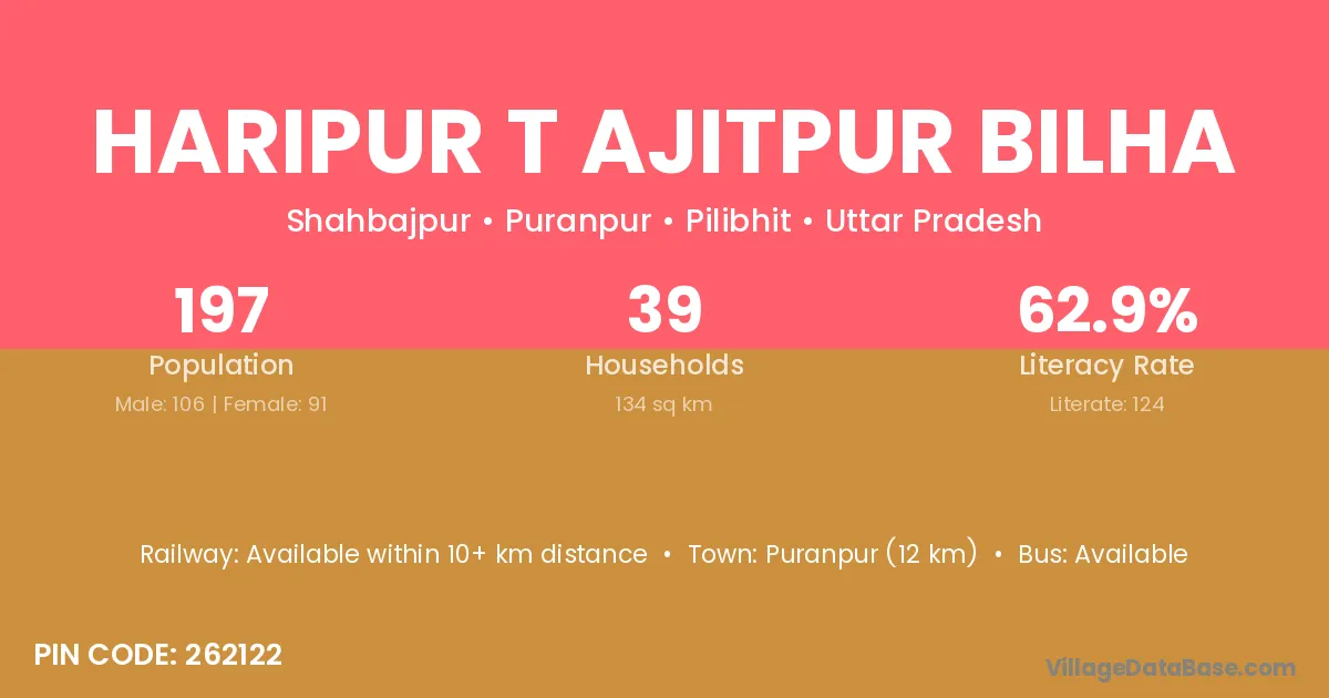 Puranpur (12 km) is the nearest town to Haripur T Ajitpur Bilha village for major economic activities and is located approximately 12 km away.