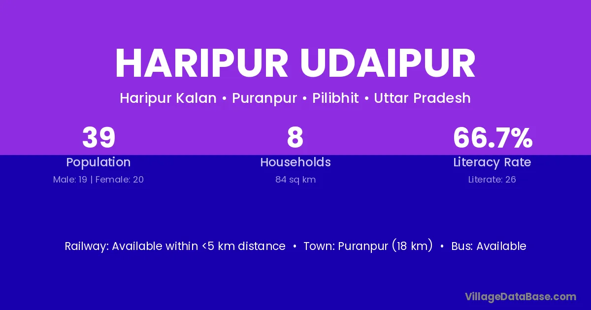 Puranpur (18 km) is the nearest town to Haripur Udaipur village for major economic activities and is located approximately 18 km away.
