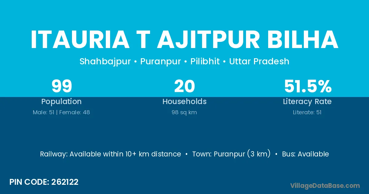 Itauria T Ajitpur Bilha village has a total population of 99 people, of which 51 are males and 48 are females.