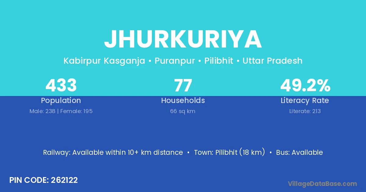 Pilibhit (18 km) is the nearest town to Jhurkuriya village for major economic activities and is located approximately 18 km away.