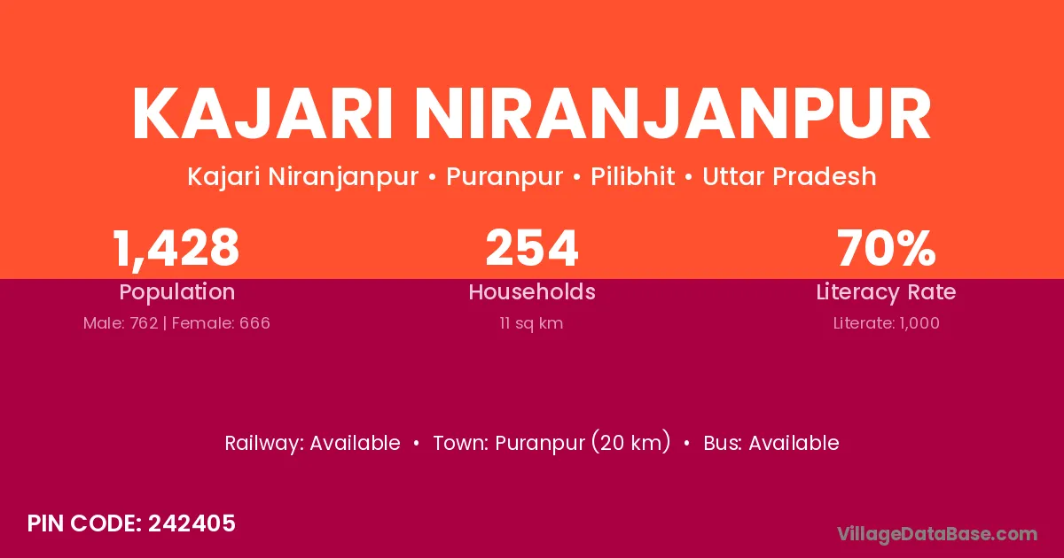Puranpur (20 km) is the nearest town to Kajari Niranjanpur village for major economic activities and is located approximately 20 km away.