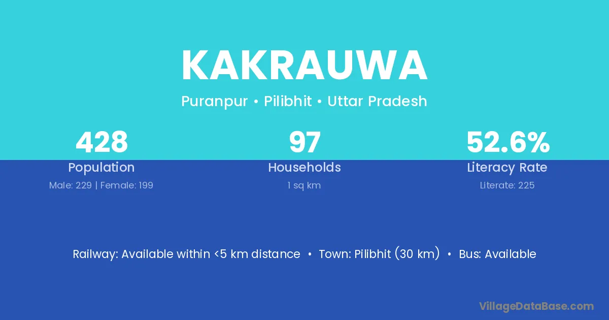 Pilibhit (30 km) is the nearest town to Kakrauwa village for major economic activities and is located approximately 30 km away.