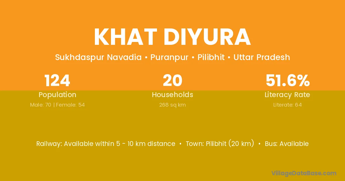 Pilibhit (20 km) is the nearest town to Khat Diyura village for major economic activities and is located approximately 20 km away.