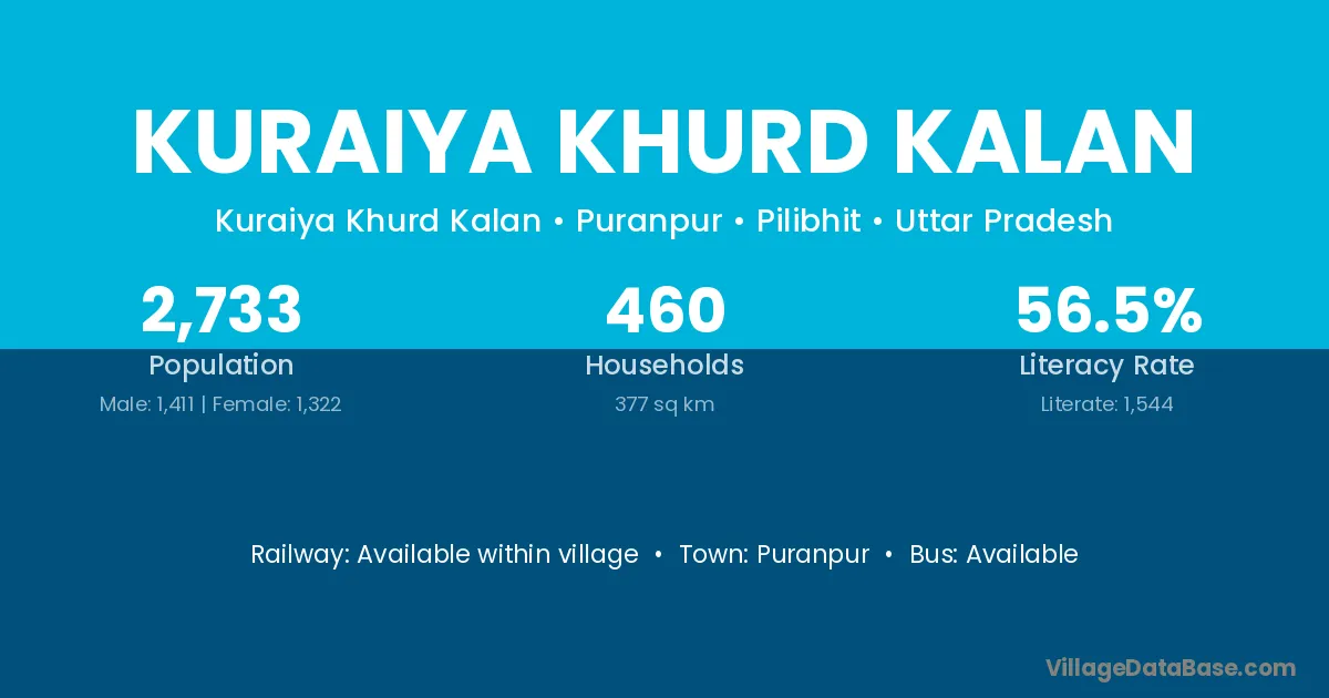 Kuraiya Khurd Kalan village has a total population of 2,733 people, of which 1,411 are males and 1,322 are females.