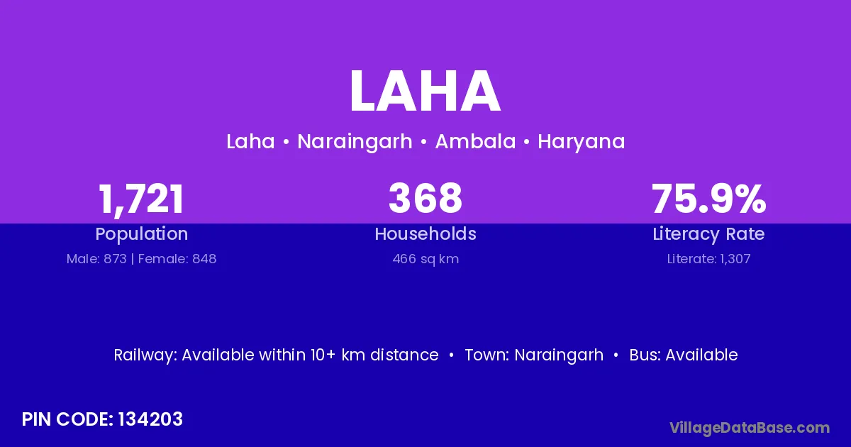 Laha village has a total population of 2,602 people, of which 1,404 are males and 1,198 are females.