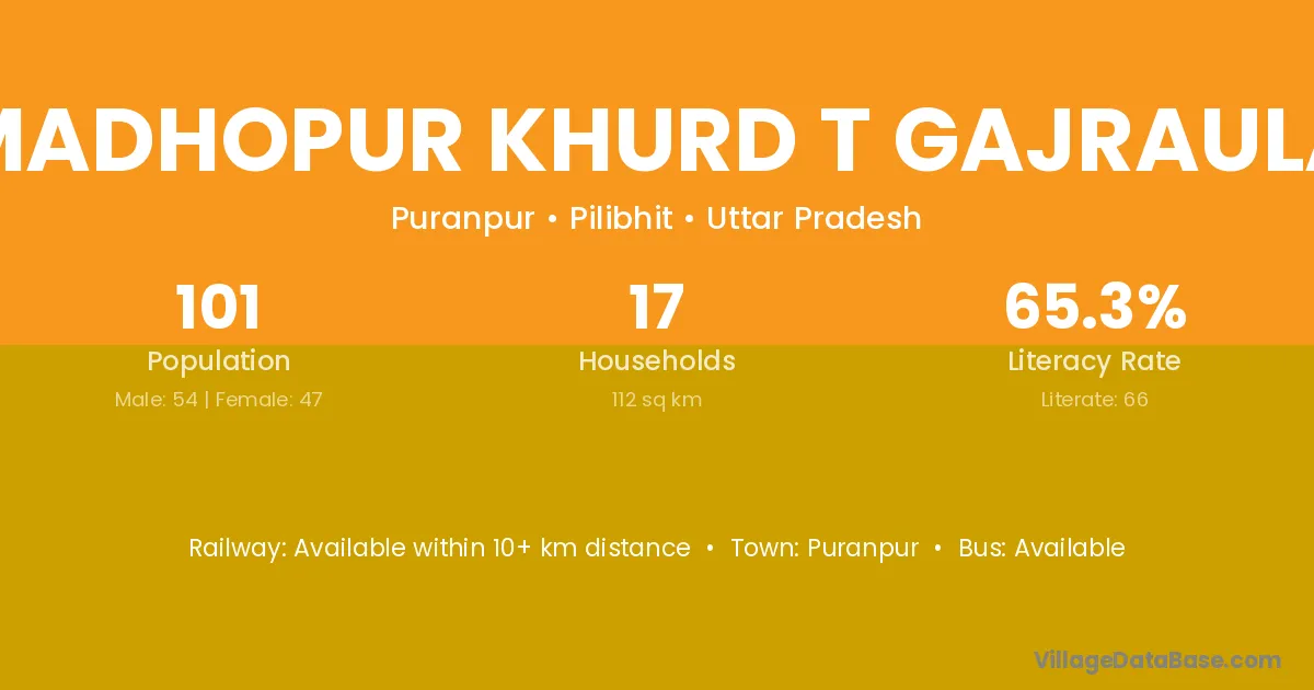 Madhopur Khurd T Gajraula village has a total population of 101 people, of which 54 are males and 47 are females.