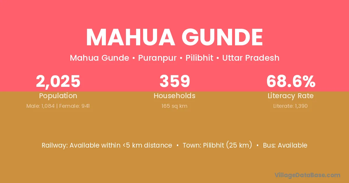 Pilibhit (25 km) is the nearest town to Mahua Gunde village for major economic activities and is located approximately 25 km away.