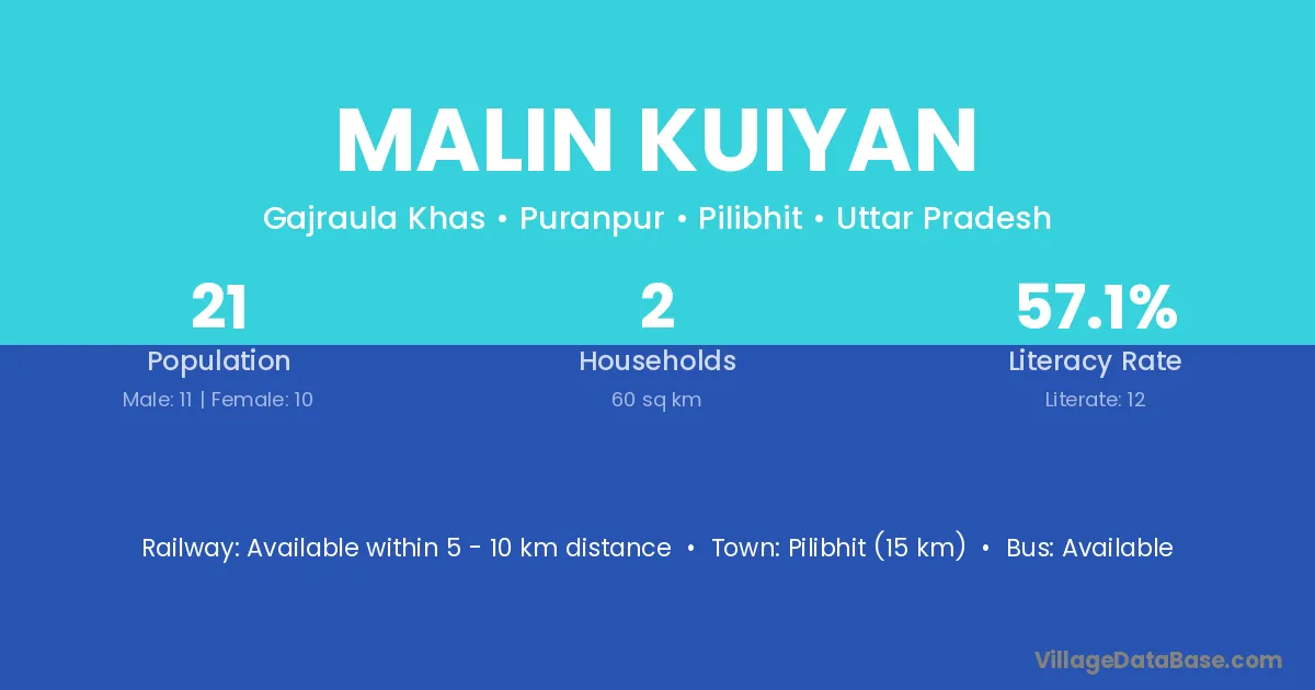 Pilibhit (15 km) is the nearest town to Malin Kuiyan village for major economic activities and is located approximately 15 km away.