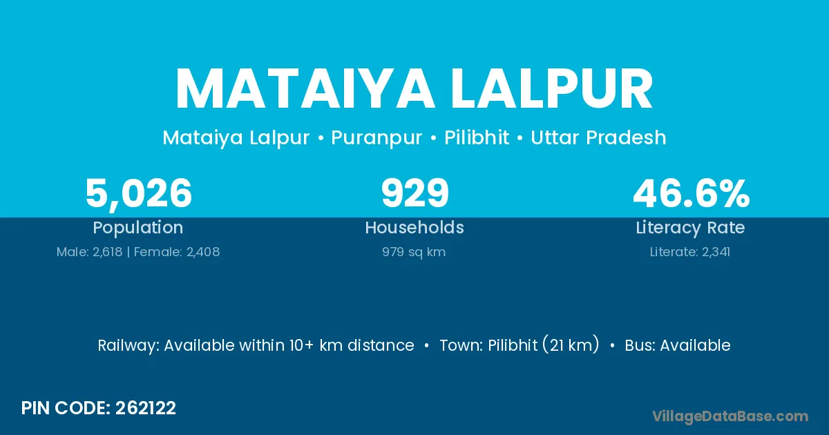 Pilibhit (21 km) is the nearest town to Mataiya Lalpur village for major economic activities and is located approximately 21 km away.
